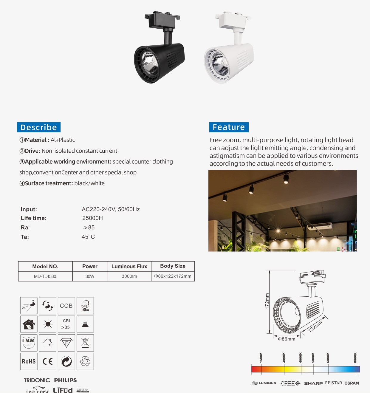 چراغ ریلی مودی TL-4530 ساخت شرکت مودی به سفارش امارات میباشد دارای وات مصرفی 32.3وات است و 3000لومن که با استفاده از یک هیتسینگ بسیار قوی و بدنه تمام المینیومی حرارت را دفع مینماید این مدل دارای طرح های اقتصادی ارزان مانندop-2230 را دارد که وات مصرفی 26 وات 2500لومن و وزن هیتسینگ کمتری هستند یکی از مهمترین ویژگی های این محصول زاویه تابش 24 درجه است که مناسبترین درجه برای قفسه و تابلو و ....میباشد بخاطر استفاده از چیپ HIGH BRIGHTNESS در مدل TL-4530 دارای شدت نور بسیار بالا و زیباترین نحو ممکن در جلوه دادن اشیا و مصرف بسیار ناچیز برق شده است این محصول هیچگونه فلیکر و لغزش در تصویر ندارد و cri بسیار بالایی دارد