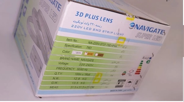 ریسه نویگیت با نوع چیپ 2835؛ ضخامت 10 میلی متری تولید شده است. ریسه با شار نوری یک متر 800 لومن؛ ولتاژ ورودی 220 ولت؛ رده مصرف انرژی A+ و طول عمر بالا نوری تولید می کند که باعث خیرگی و زدگی چشم نمی شود